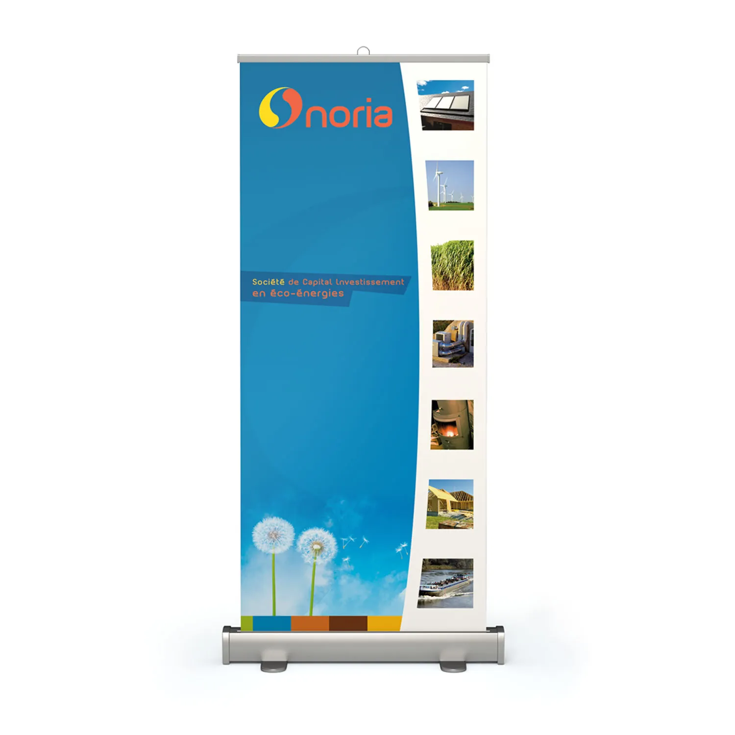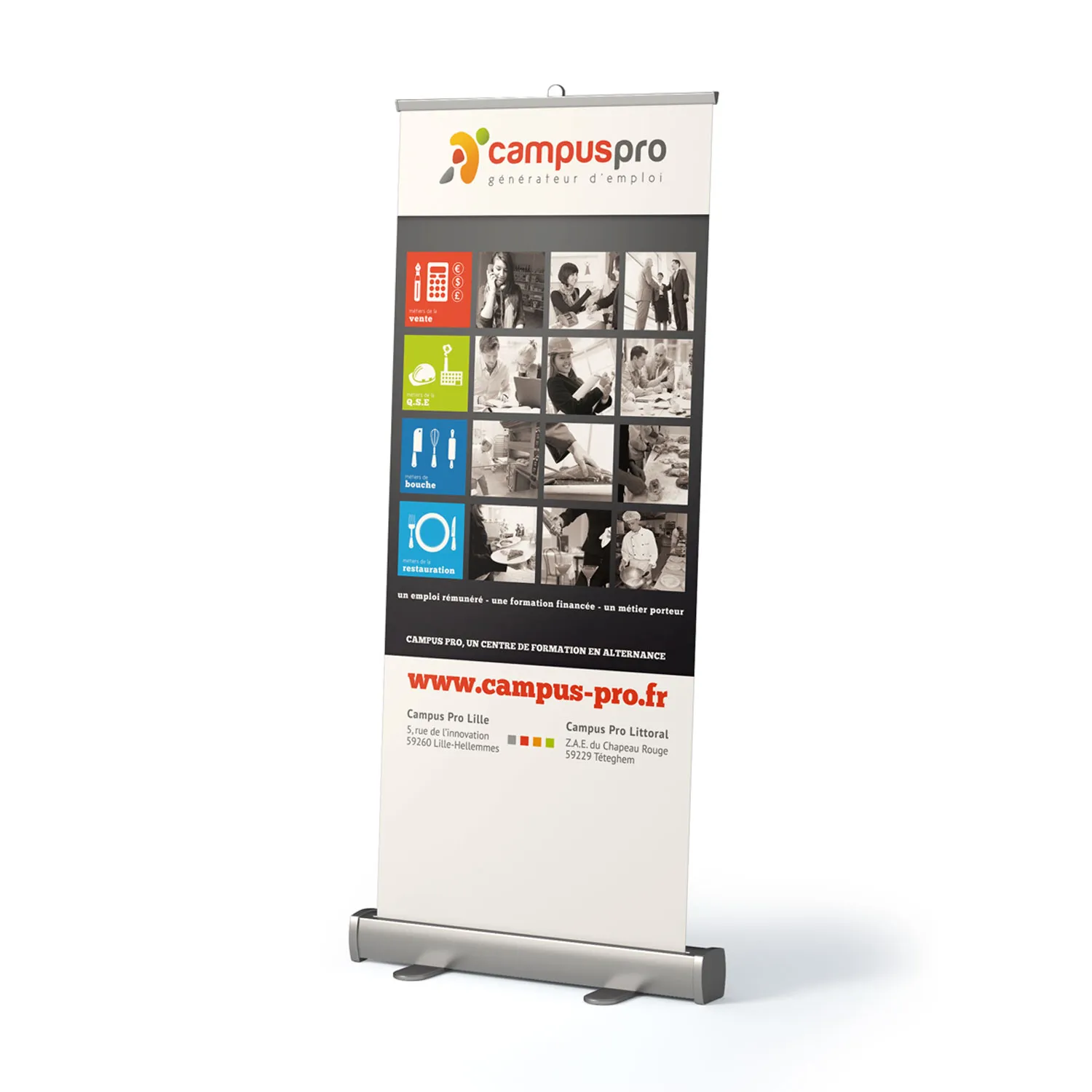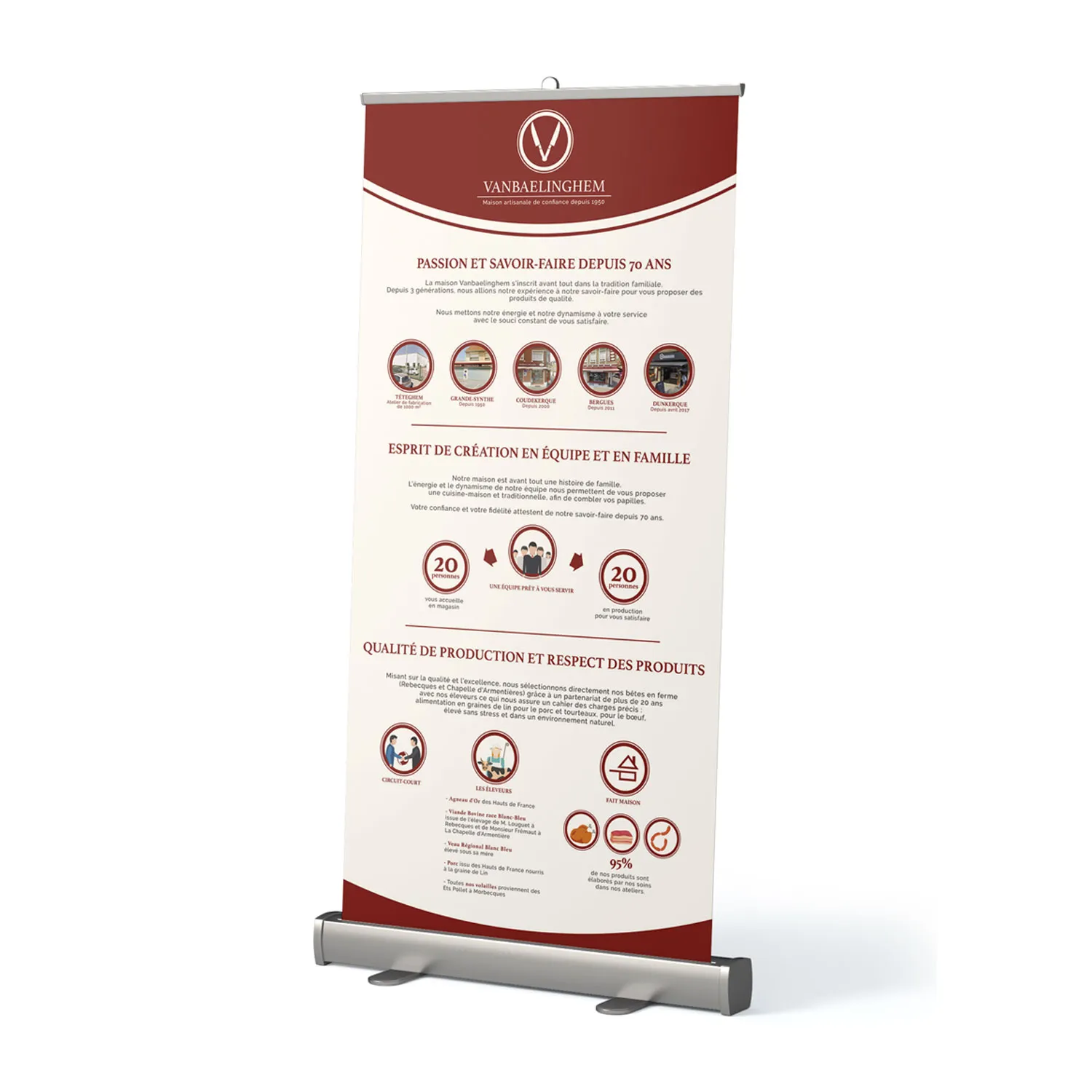 Support vertical léger et élégant, le kakémono est idéal pour afficher vos messages de manière visuelle et structurée. Facile à installer et à transporter, il habille vos salons, halls ou points d’accueil avec impact et clarté.