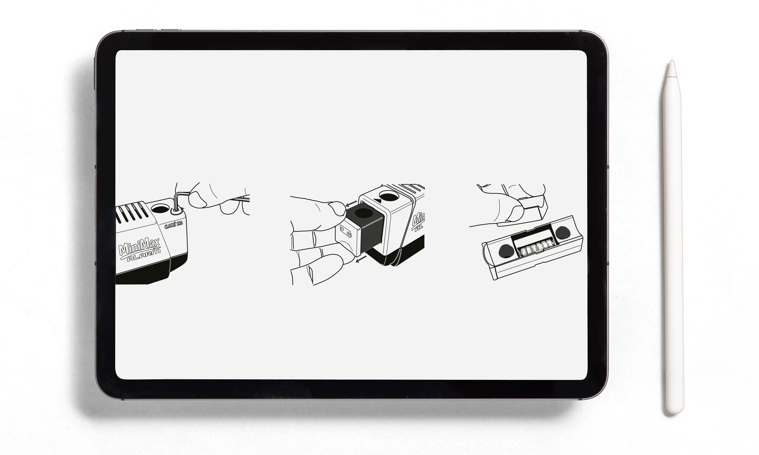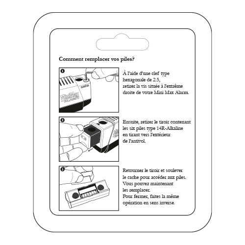 MISSION : Trois illustrations permettant une explication d'emploi pour le changement des piles de l'antival Mini Max de la marque Vector.