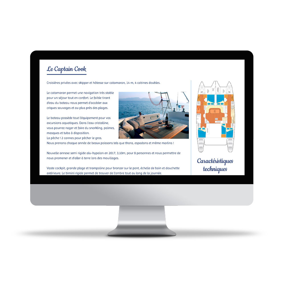 MISSION : Création du design du site Captain Cook Croisières, une entreprise proposant des croisières privées en catamaran avec skipper en Méditerranée. L'identité visuelle a été conçue pour évoquer l'évasion et la sérénité : palette de bleus marins et de blancs épurés, typographies élégantes, mise en page aérée. Chaque section du site a été pensée pour guider l'utilisateur avec fluidité, mettant en avant les destinations, les services à bord et les options de réservation. Le design vise à transmettre une sensation de liberté et de professionnalisme, tout en assurant une navigation claire sur desktop comme sur mobile. Projet de réalisation avec Éric Debrosse (www.editprod.fr)