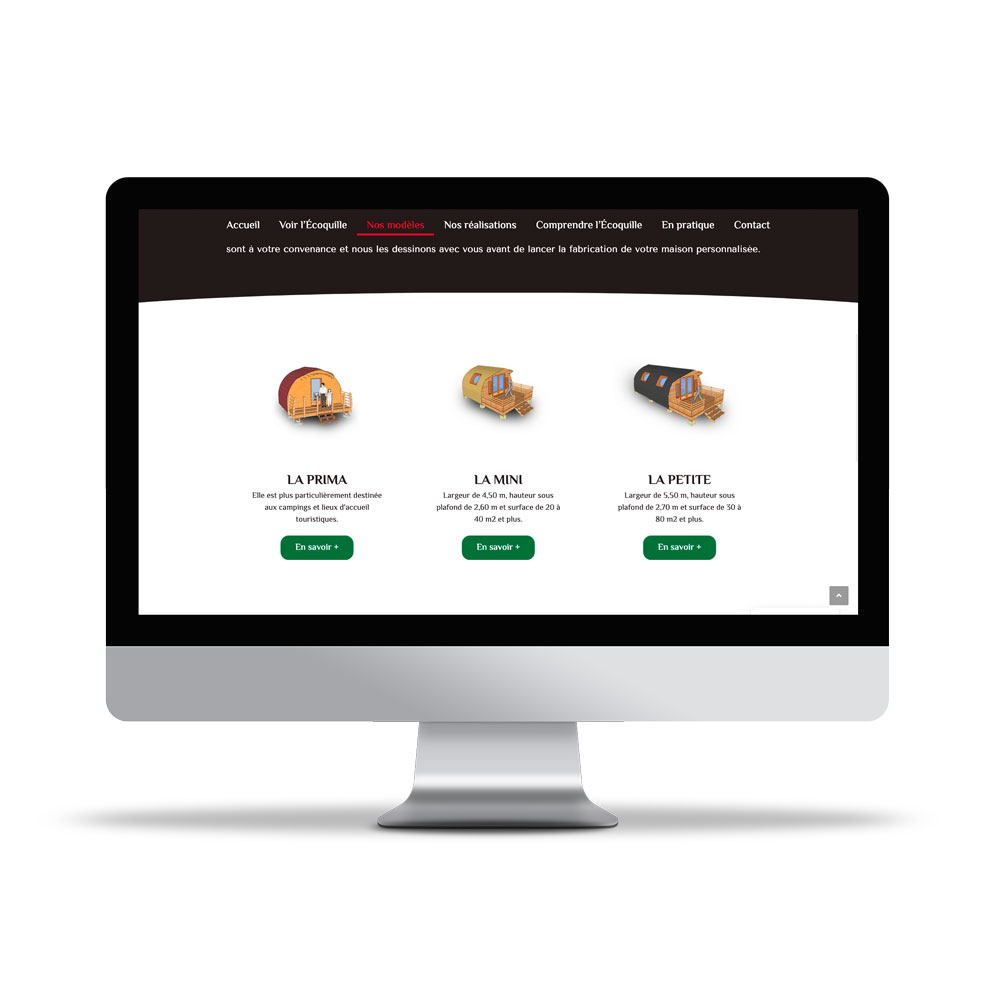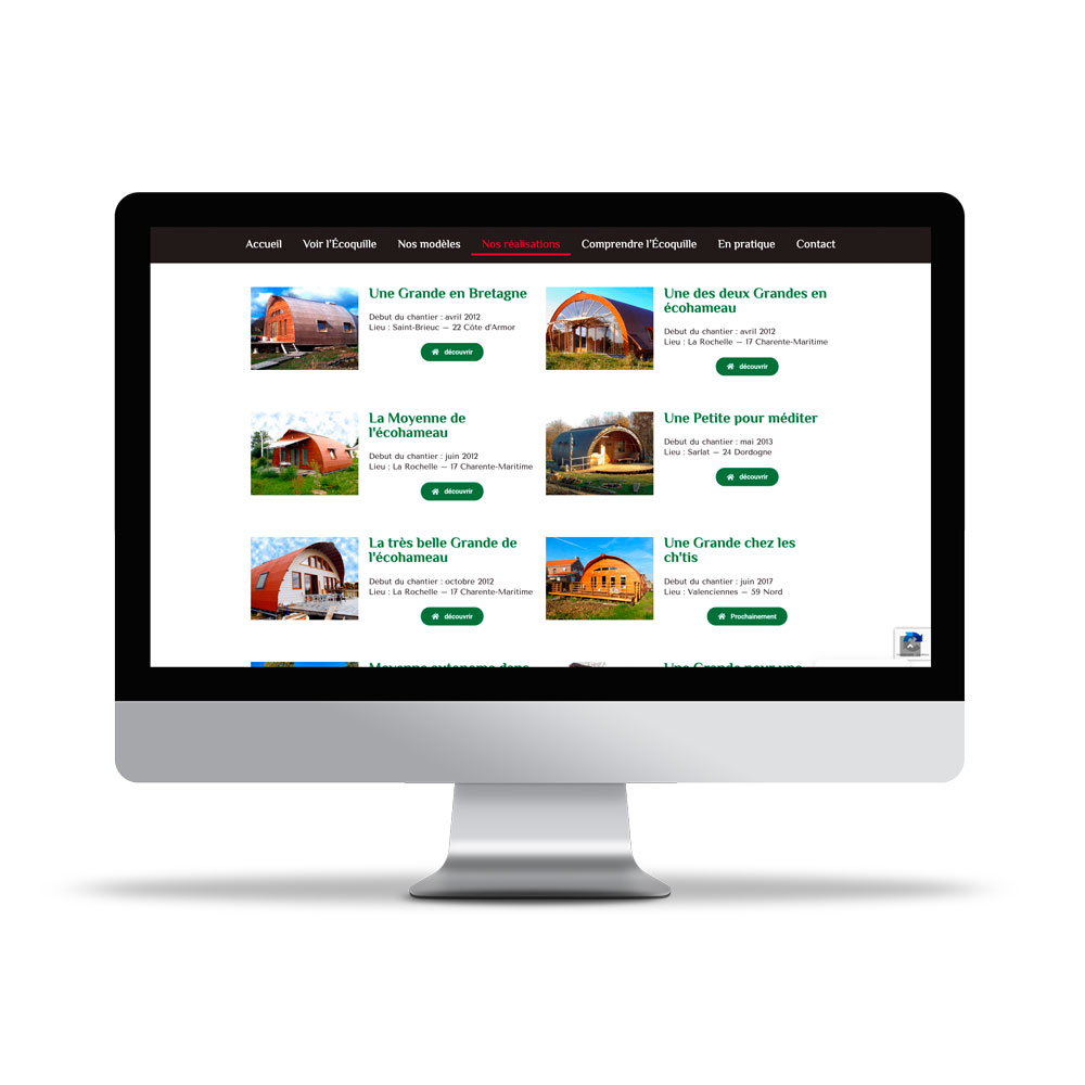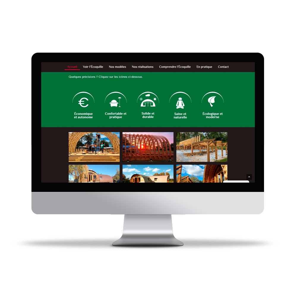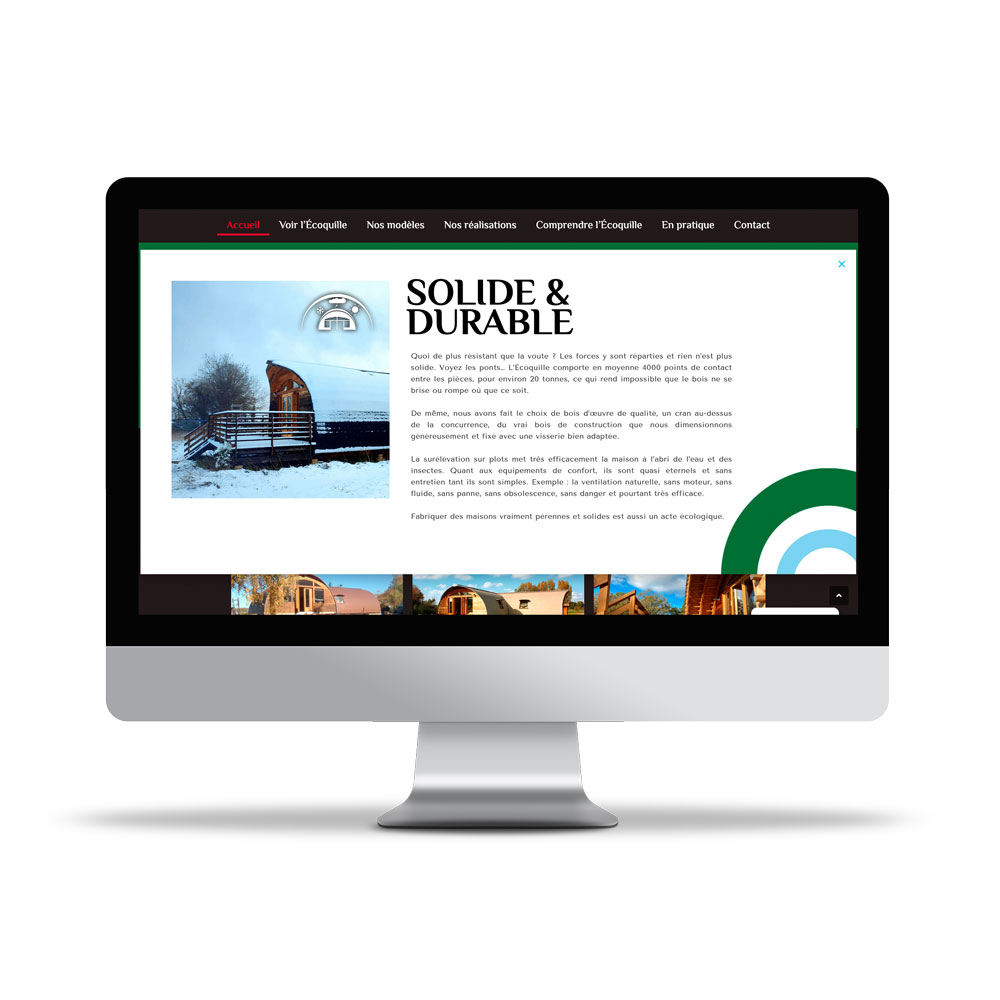 MISSION : Réalisation complète du site. (design et architecture). Un design au couleur de l'écoquille et rappelant le côté écologique du projet. Retouche de nombreux visuels et créations de pictogramme. Site entièrement responsive. Il permet au futur client de se faire une excellente d'idée de la réalisation d'une maison Écoquille.