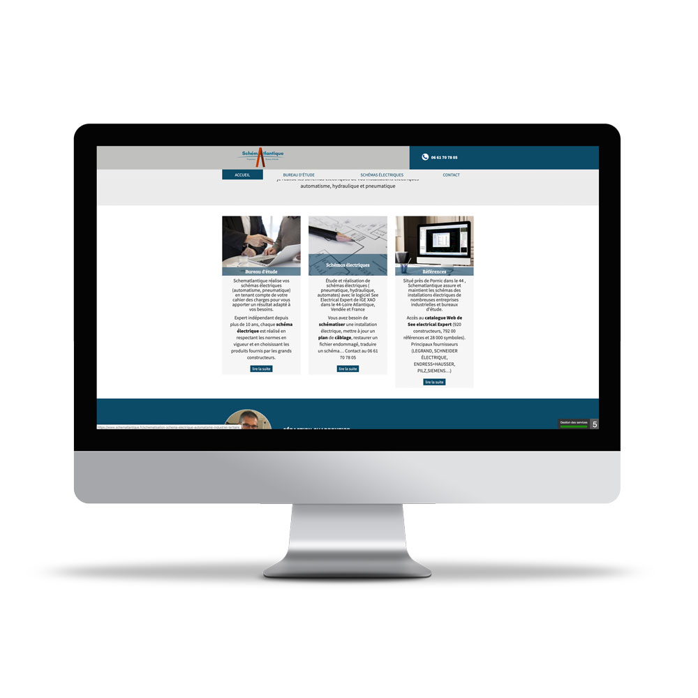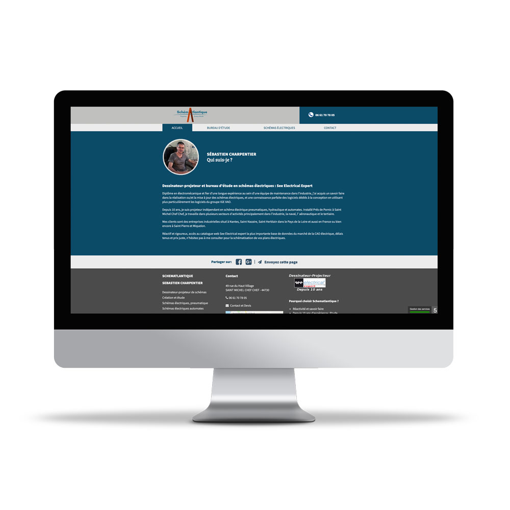 MISSION : Création du design du site SchémAtlantique, un bureau d'études spécialisé dans la réalisation de schémas électriques. L'identité visuelle a été développée pour refléter la précision et le professionnalisme : palette de couleurs techniques, typographies claires, mise en page structurée. Le site présente les services proposés, avec des exemples de schémas et des descriptions détaillées. Le design vise à transmettre une image de compétence et de rigueur, tout en assurant une navigation intuitive sur desktop comme sur mobile. Projet de réalisation avec Éric Debrosse (www.editprod.fr)